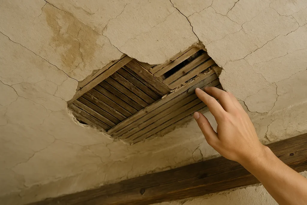 Before starting the renovation of a plasterboard ceiling, a complete diagnosis is essential. Start with a thorough visual examination to identify cracks, moisture, or deformed areas. You can gently tap the surface to detect unstable areas—a hollow sound usually indicates a separation between the plaster and the wooden slats.