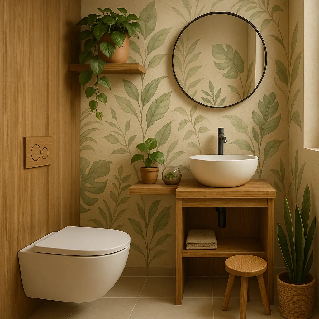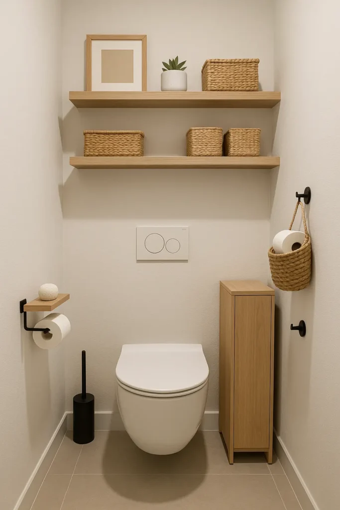 Le bois apporte instantanément chaleur et caractère. Une tablette en chêne massif, un petit tabouret en bambou ou des accessoires en rotin créent une ambiance authentique dans les toilettes même les plus exiguës. Ces matériaux naturels font écho à notre philosophie d’intérieurs vivants et respirants.