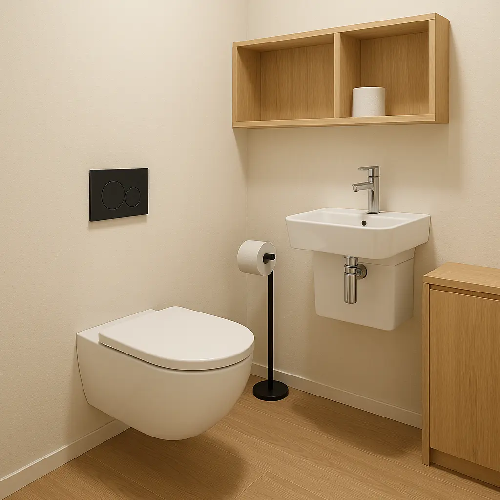 - Les équipements suspendus comme les WC et lave-mains compacts libèrent l’espace au sol et facilitent l’entretien.